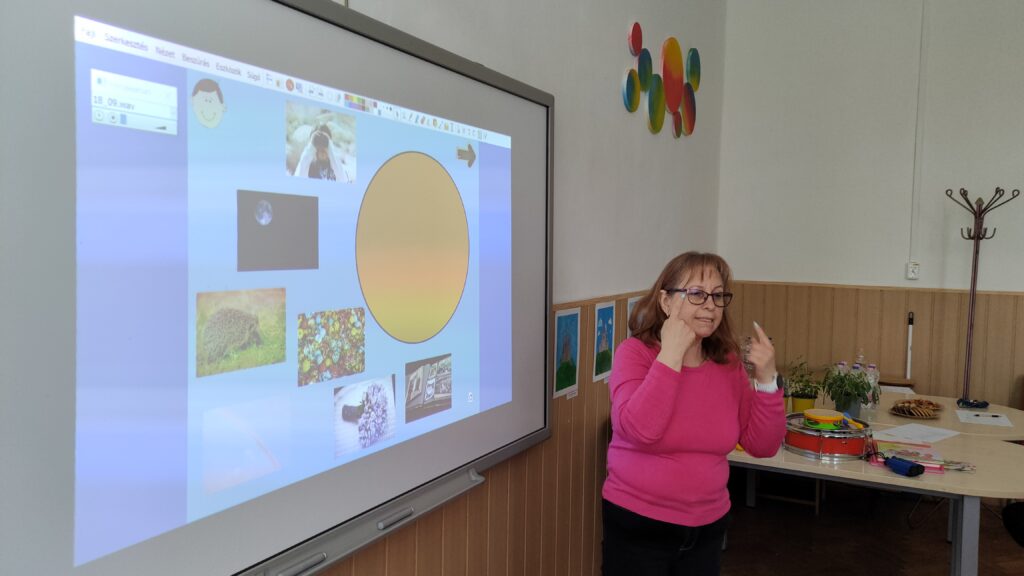 A résztvevők bemutató foglalkozás keretein belül betekinthettek a „DigiMóka” – digitális feladat- és játékgyűjtemény súlyosan és halmozottan fogyatékos tanulók fejlesztő iskolai neveléséhez-oktatásához című gyűjtemény gyakorlati alkalmazásába. A bemutató foglalkozás a Székhelyintézményünk volt, amely a Szűkebb és tágabb környezet elnevezést kapta. Ez az alkalom dalos, mondókás bevezetéssel, majd multiszenzoros feladatokkal indult, majd ezeket követte az érzékszervekhez kapcsolódó DigiMóka feladat.