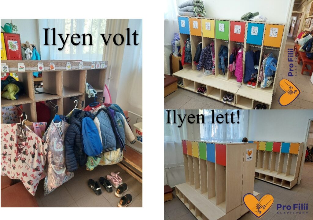 A „Szeresd még jobban” Az értelmi fogyatékos óvodásokért alapítvány 1 144 000,-Ft-os támogatást nyert a ProFilii Alapítványtól 2025. nyarán. Ezt a támogatást az Éltes Mátyás Óvoda, Általános Iskola és EGYMI Tüskevár Tagóvoda fejlesztésére használtuk fel. Lecseréltük a régi, elavult öltözőszekrényeket, színes modern bútorokra, melyek segítségével minden fogyatékkal élő óvodás számára lehetőség lesz az óvodában használt ruhákat, cipőket megfelelően tárolni.